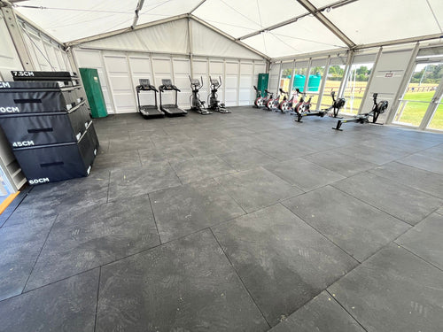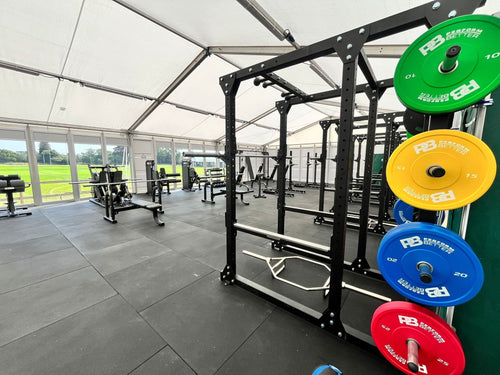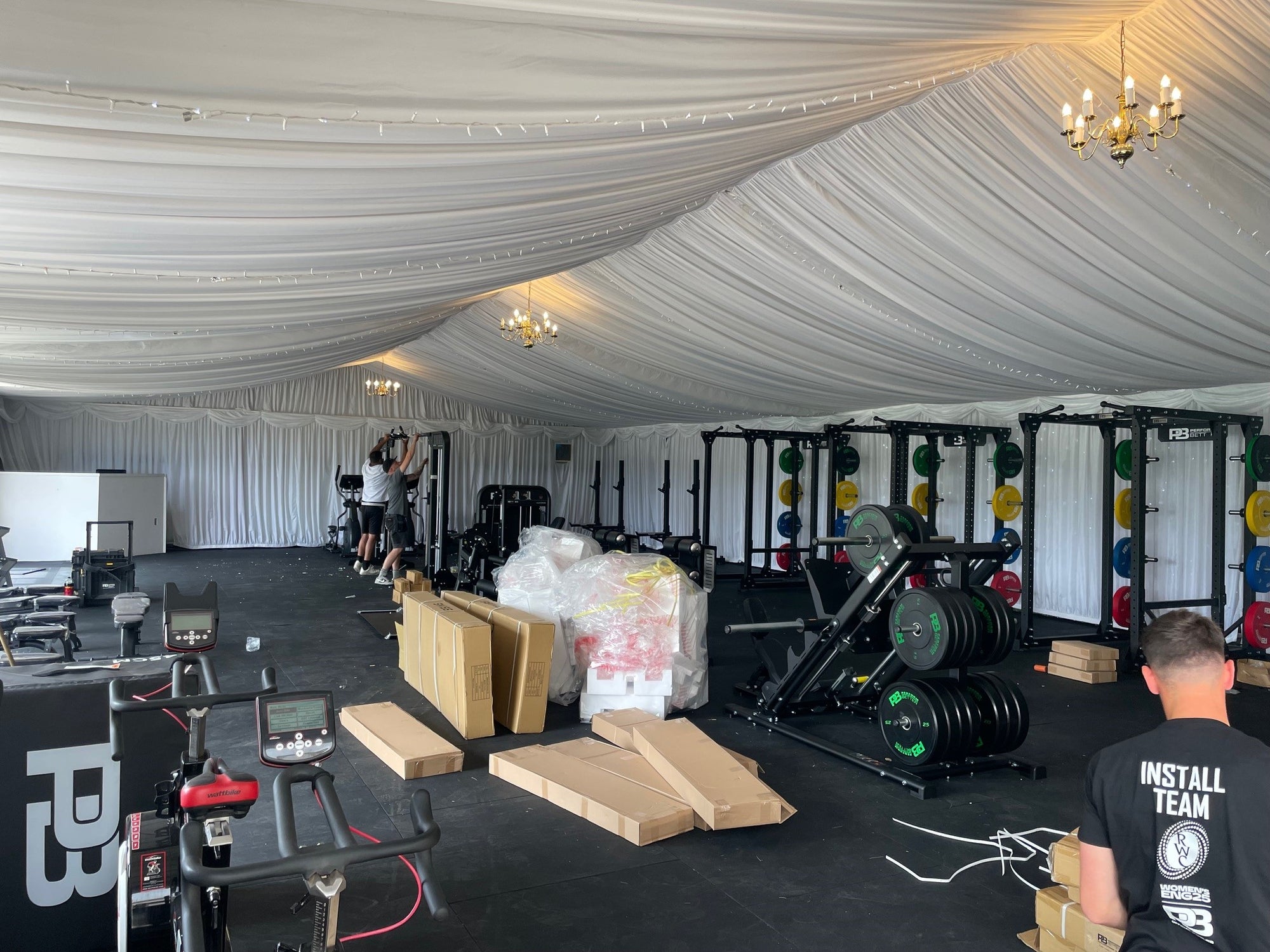 A great effort from the PB team here. Two complete builds from start to finish. One large gym in a marquee on the outskirts of town with the build from the floor up, and the second in the centre of town in an established Bowls centre with protective floor added first, then the S&C suite on top - creative but effective.