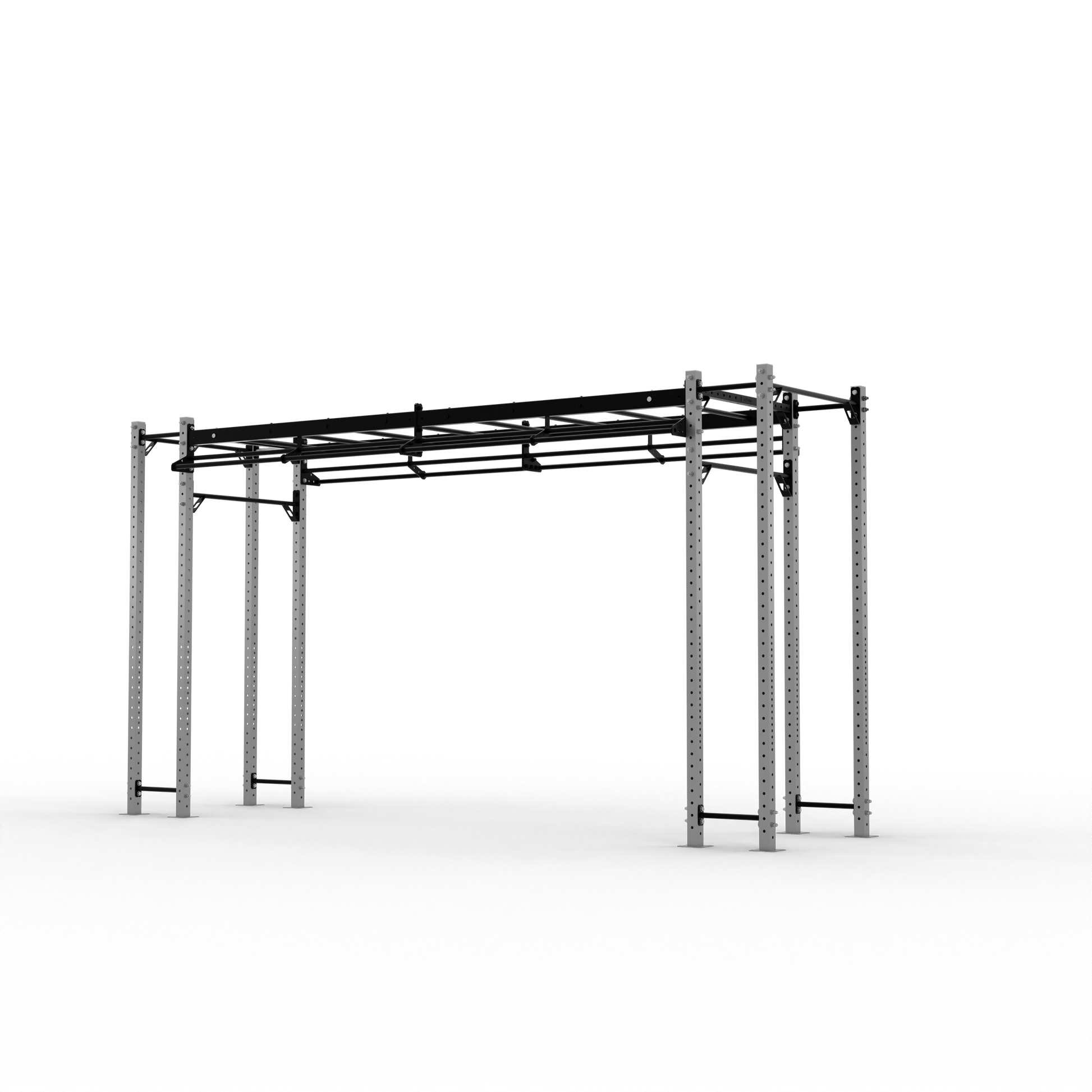 The PB Bridge Rig is available in several spans up to 10 metres and is ideal for various group functional fitness sessions and body weight workouts. This open format frame is designed to maximise your training area while retaining valuable floor space. Configure the base unit with our large range of attachments and storage shelves to create a system that meets your needs and engages members. The 5m Bridge includes a monkey bar run plus 10 pull-up points suitable for muscle-ups, and can accommodate up to 2 squat stations facing inwards or outwards.-
