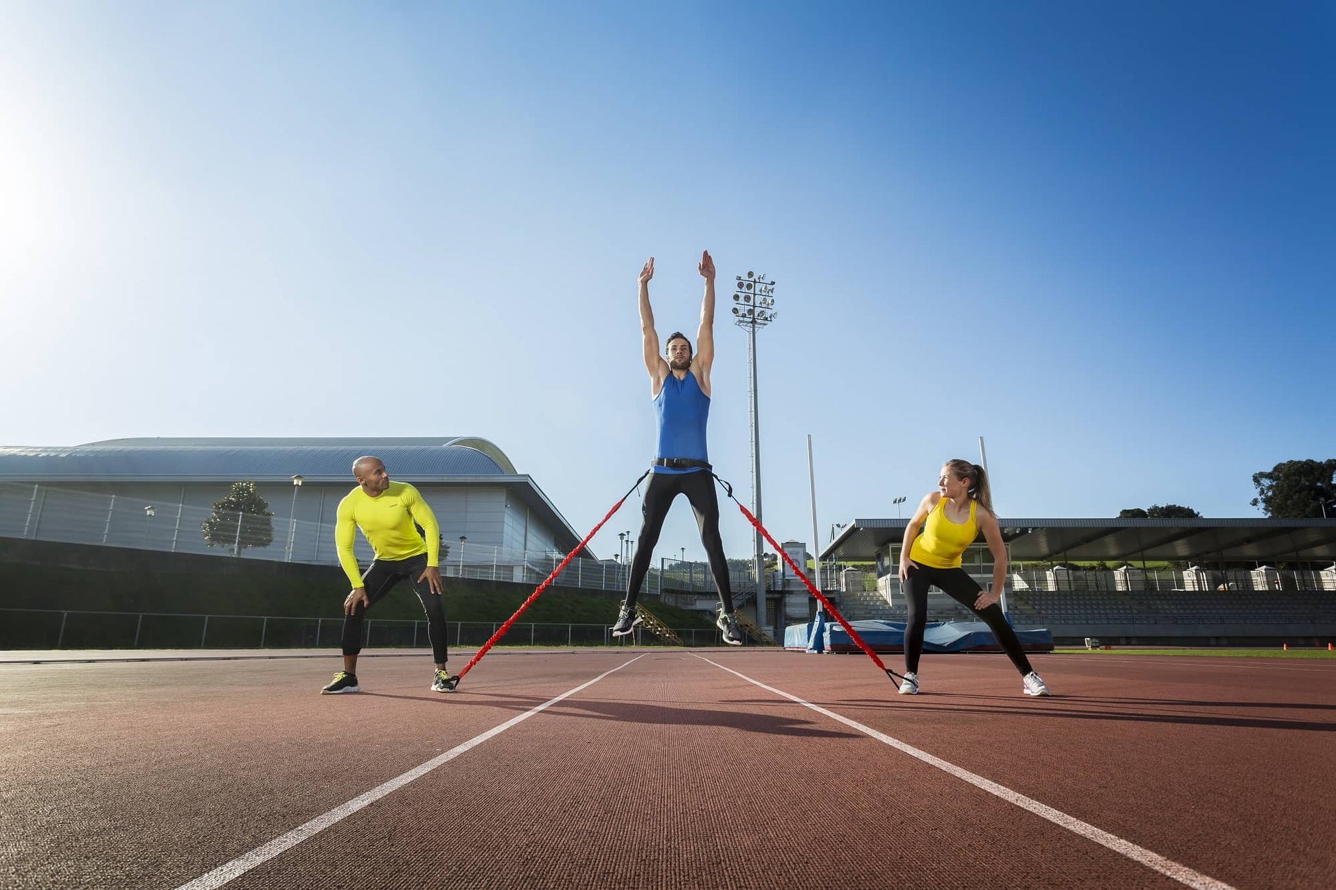 The perfect training tool for increasing your lower body explosive power. Two people fix the flexicords to their feet to provide resisted jump training.