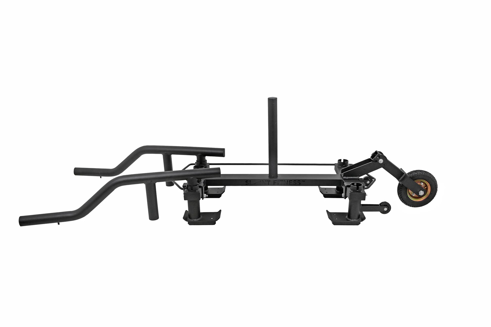 The WheelBarrow Sled is an all-surface, weight sled perfect for pushing and pulling. It also works as a WheelBarrow thanks to the inbuilt wheel. It has a number of innovative features such as a detachable central weight loading pole, wrap around rail to prevent the need to unclip your belt and strap when changing direction and stores completely upright to save space.